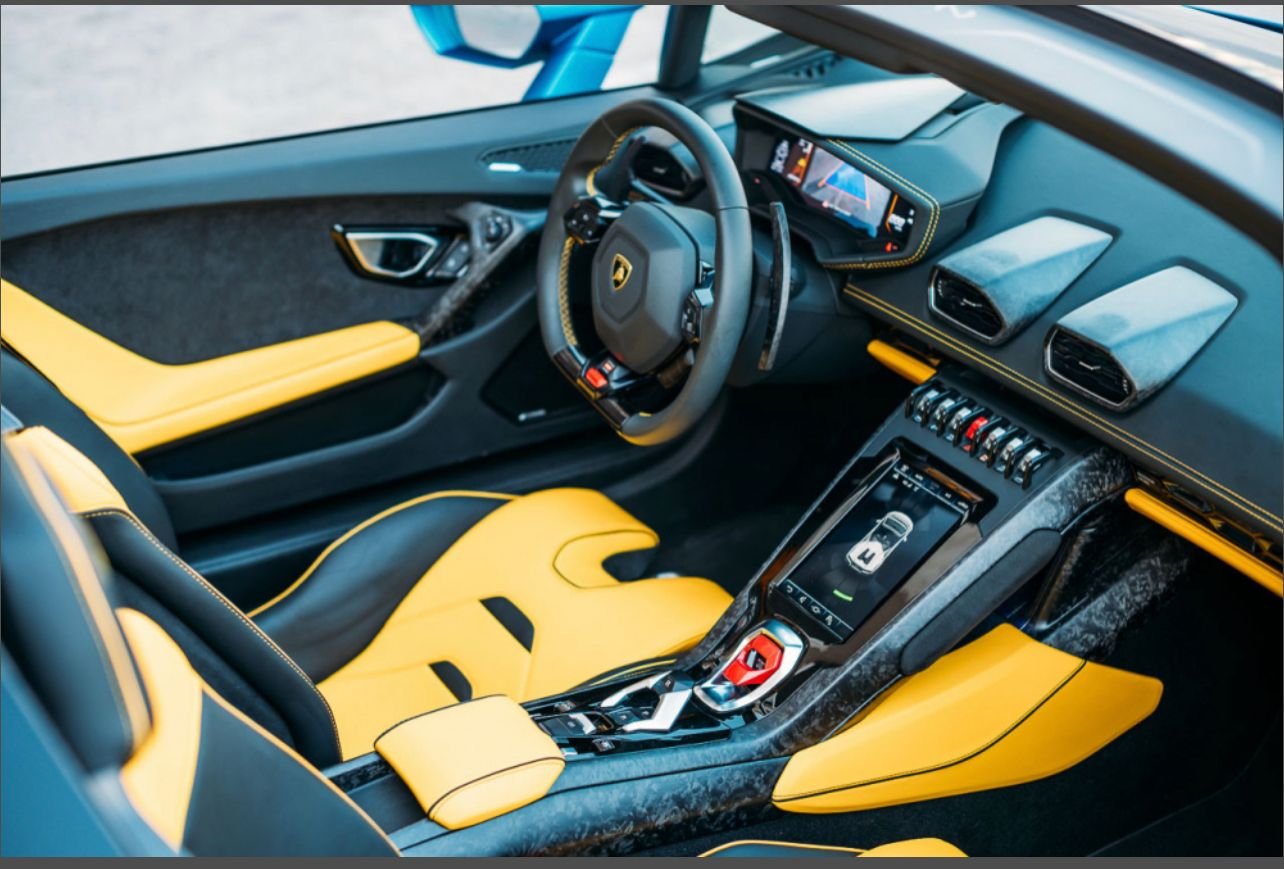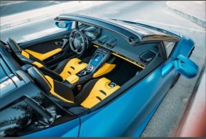 The Huracan Evo Spyder was created to amplify your driving experience to the max. It is a drop-top sibling of the Lamborghini rent Dubai Huracan Evo Coupe and it boasts the 5.2 litre V10 engine borrowed from the Huracan Performante which provies a neat 640 horsepower. Althought, the Lamborghini Huracan Evo Blue Spyder 2021 soft top opens in an impressive 17 seconds, it adds 265 pounds to the lambos curb weight resulting in a 0-60 m/hr time of 3.1 seconds and a top speed of 201 mph.