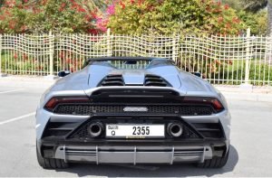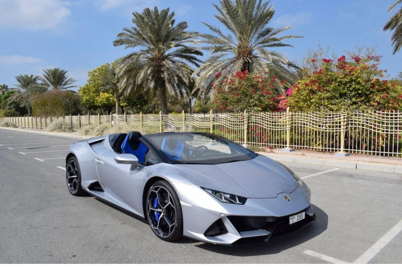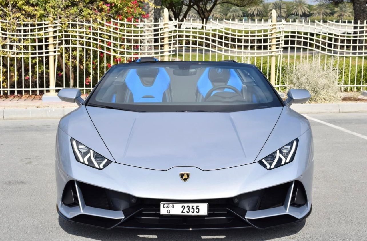 Rent and drive this Lamborghini Huracan Evo Spyder Silver 2021 -model in Dubai, UAE for AED 2600/day. Rental cost includes basic comprehensive insurance and a standard mileage limit of 250 km/day (AED 20 per additional km applicable). A security deposit of AED 5000 is required. Contact us +971561154053